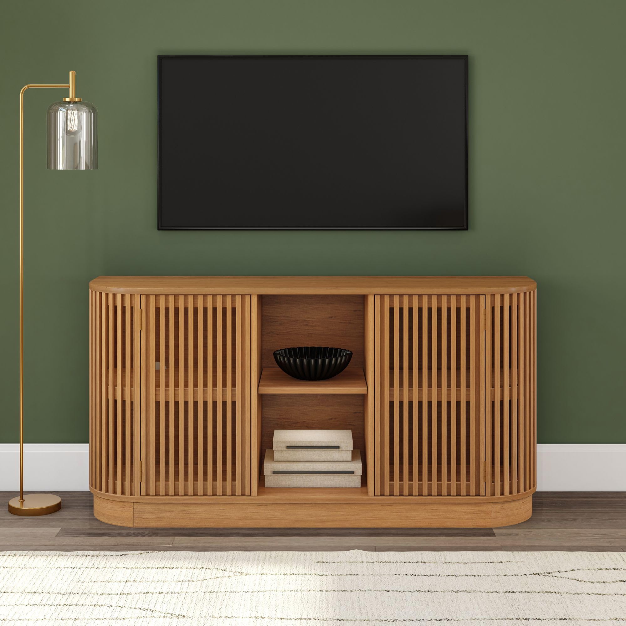 Plank+Beam Contour Wood TV Stand, Two Door Solid Wood Entertainment Console with Storage, 59" L x 16" W x 30" H, Pecan