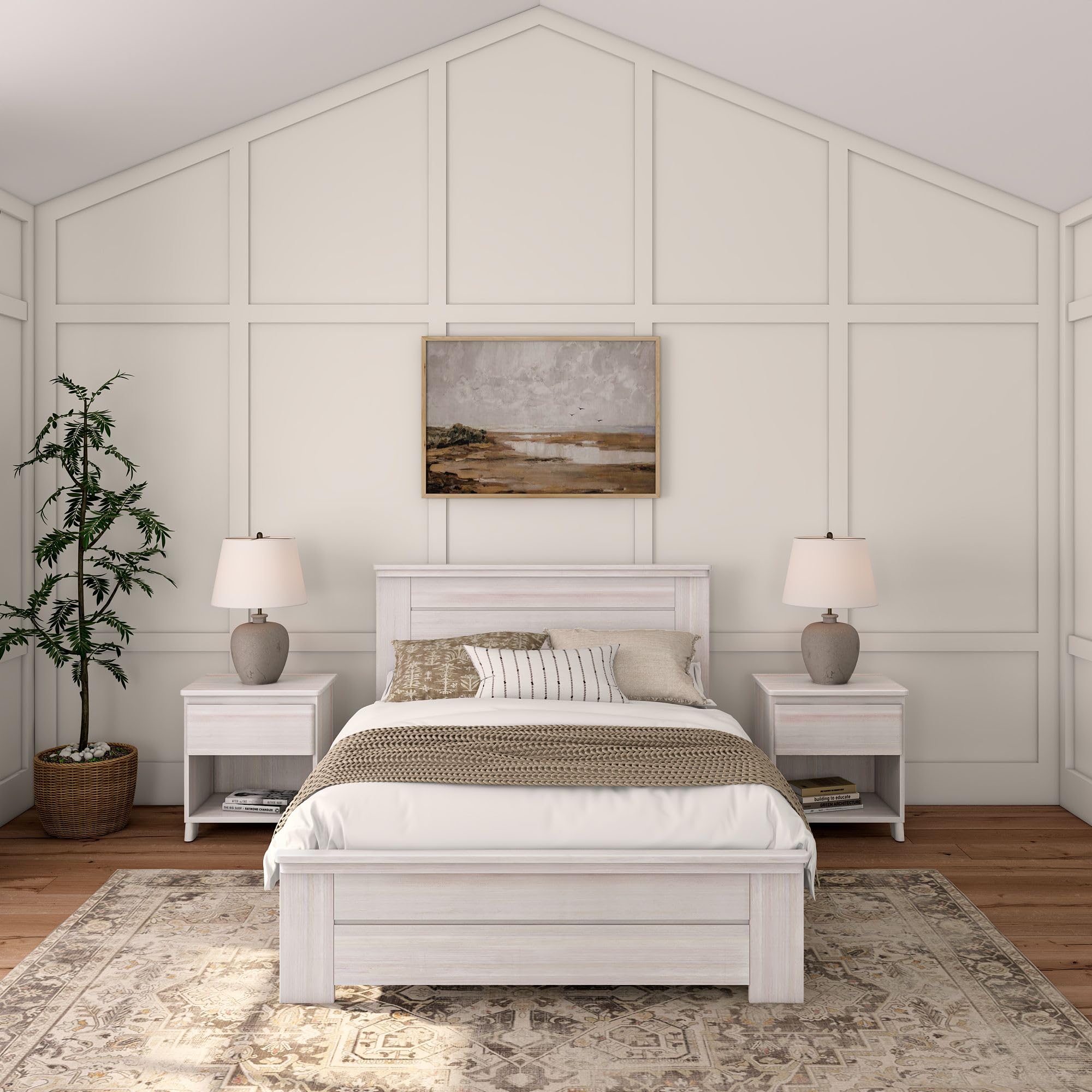 Plank+Beam Rustic Wood Full Bed Frame, Platform Bed with Headboard, Solid, White Wash